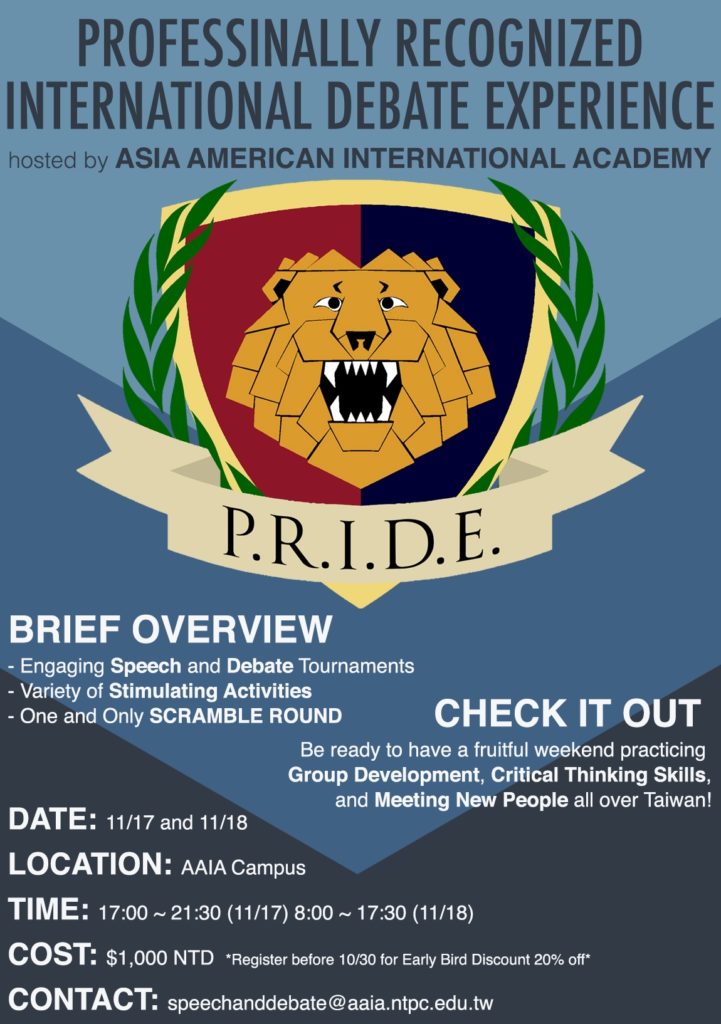 In mid-November, the Speech and Debate team hosted AAIA’s first nationwide academic competition.The 1st Annual Professionally Recognized Invitational Debate Experience (P.R.I.D.E.) featured competitors in grades 5 through 12 from schools in New Taipei, Taipei, Hsinchu, and Tainan. On Day 1, students competed in the qualifying rounds for impromptu and duo interpretation, while also honing their […]
