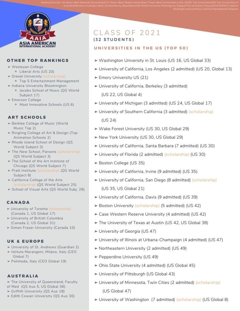 恭喜AAIA 2021畢業生!86%的畢業生錄取全球及US前50大大學,其中有18名畢業生更進入了US前35大名校。